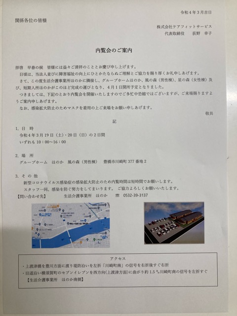 報告 グループホームほのか 内覧会のお知らせ 2022年3月17日 かねてより建設中のグループホームほのか・短期入所ほのかが完成の運びとなり、4月1日開所予定となりました🍀つきましては、3月19日(土)、20日(日)に内覧会を開催いたします❗皆様方のご来場をスタッフ一同、心よりお待ちしております😊