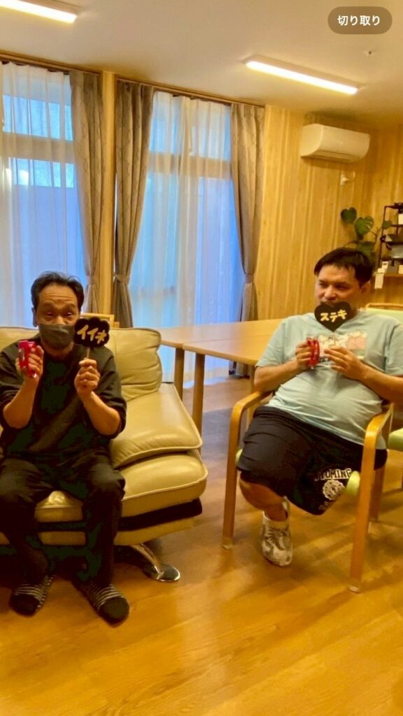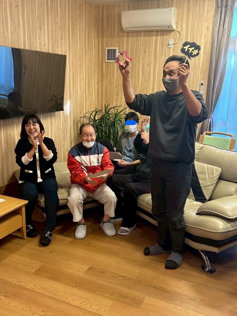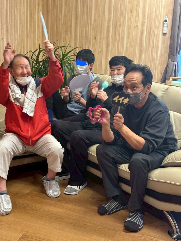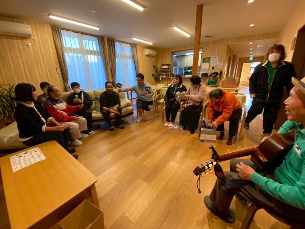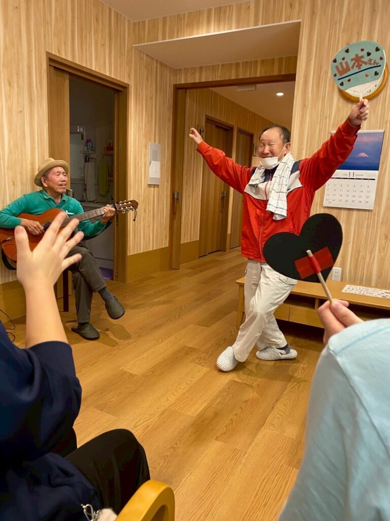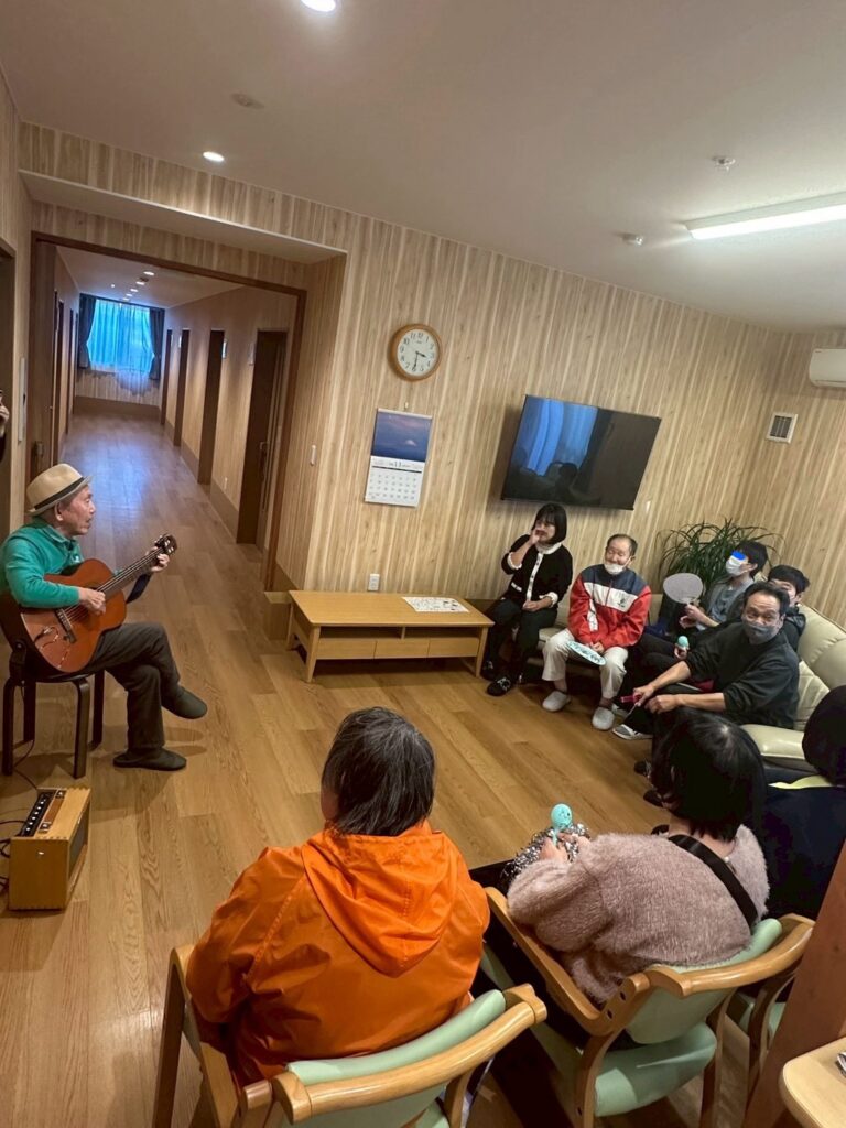 イベント グループホームでコンサート 2025年12月9日 今回はグループホームほのかでギターコンサートを行った時の様子を紹介します📣 ギターが得意な職員が童謡などの懐かしの曲を演奏し、盛り上がりました🎸 応援のうちわを持ちながらギター演奏を楽しみました✨ 大盛り上がりで、思わず立ち上がってしまう入居者さんもいました🎉 またみんなでギターコンサートを楽しみましょう✨