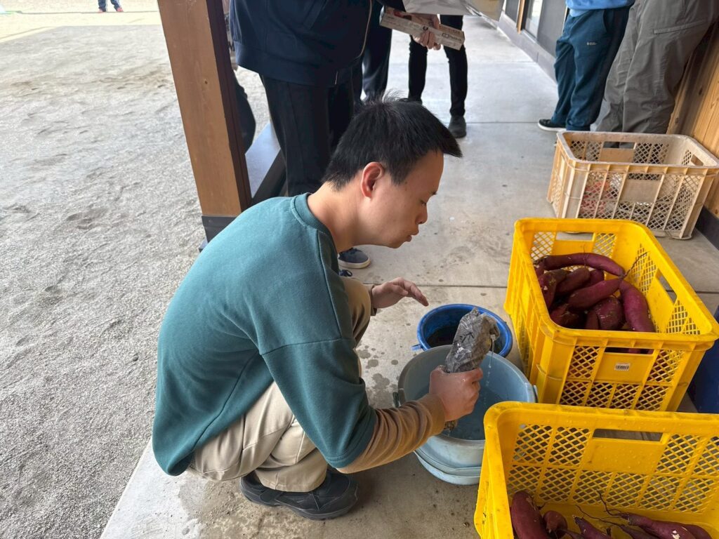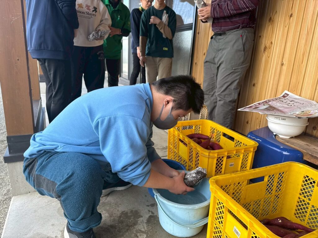 さつまいもを水で洗い、新聞紙とアルミホイルで包んで焼き芋の下準備をしました!